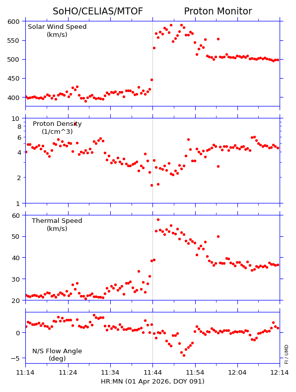 01 Apr 2026 (DOY 091 1144 UT) zone 2, ??Origin: 30 Mar 0247 UT, X1.4 x-ray flare in region 4405, travel time 57 hours